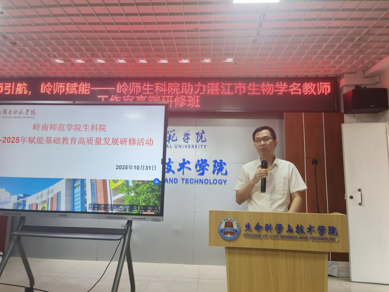 为深化基础教育领域生物学学科交流,提升湛江市生物学名教师工作室成员专业素养与实践能力,2025年10月31日,岭南师范学院生命科学与技术学院联合湛江市潘飞宇、许宇放、赵丽平、罗碧梅四个生物学名教师工作室,共同举办“名师引航,岭师赋能——岭师生科院助力湛江市生物学名教师工作室高端研修班”。广东省“粤派名师”潘飞宇工作坊主持人潘飞宇老师、工作坊核心成员以及来自湛江市各区县的生物学骨干教师齐聚岭师,开启了紧张而充实的研修之旅。研修班由生科院院长刘锴栋教授主持。